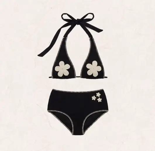 The Atlantic Beach Midnight Daisy Bikini Set features a classic black silhouette elevated with delicate hand-crafted floral appliqués. The halter triangle top enhances your natural shape, while the high-waisted bottom offers a flattering, confident fit.