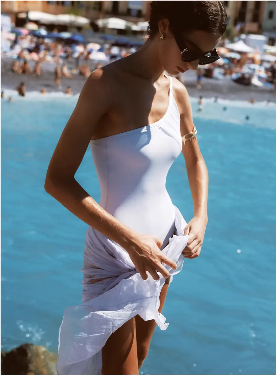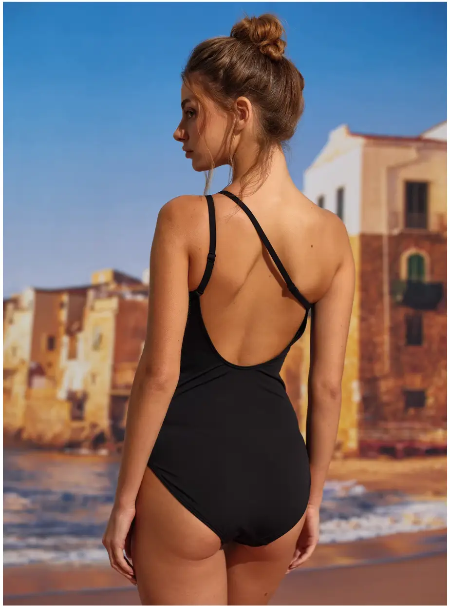 Designed with a sleek asymmetric neckline and elegant open-back silhouette, this swimsuit combines modern minimalism with flattering structure. The one-shoulder design highlights the neckline and shoulders while the sculpting fabric gently hugs your body to create a smooth, confident fit.
